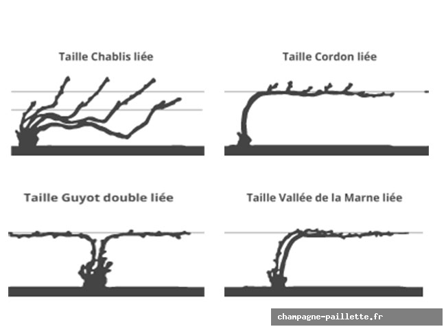 Parmi les travaux de la vigne, la taille est l’acte fondateur, s’effectue selon 4 standards définis par l’AOC Champagne (Chablis, Cordon, Guyot et Vallée de Marne).