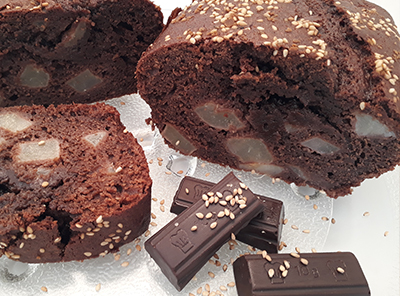 Fouetter les oeufs et le sucre, ajouter le beurre fondu, puis le chocolat, la farine, les dés de poire, et la poudre d'amande.